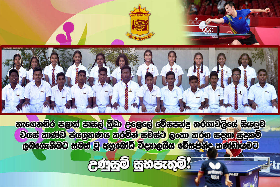 01 Oct2020 නැගෙනහිර පළාත් මේස පන්දු තරඟාවලියේ නැගෙනහිර පලාත් පාසල් ක්රිඩා උලෙලේ මේස පන්දු තරගාවලියේ සියලුම වයස් කාන්ඩ ජයග්රහණය කරමින් සමස්ථ ලංකා තරග සදහා සුදුසුකම් ලබාගැනිමට අග්රබෝධ් ව්ද්යාලය සමත් විය. Read more ...