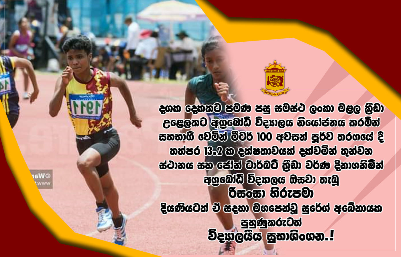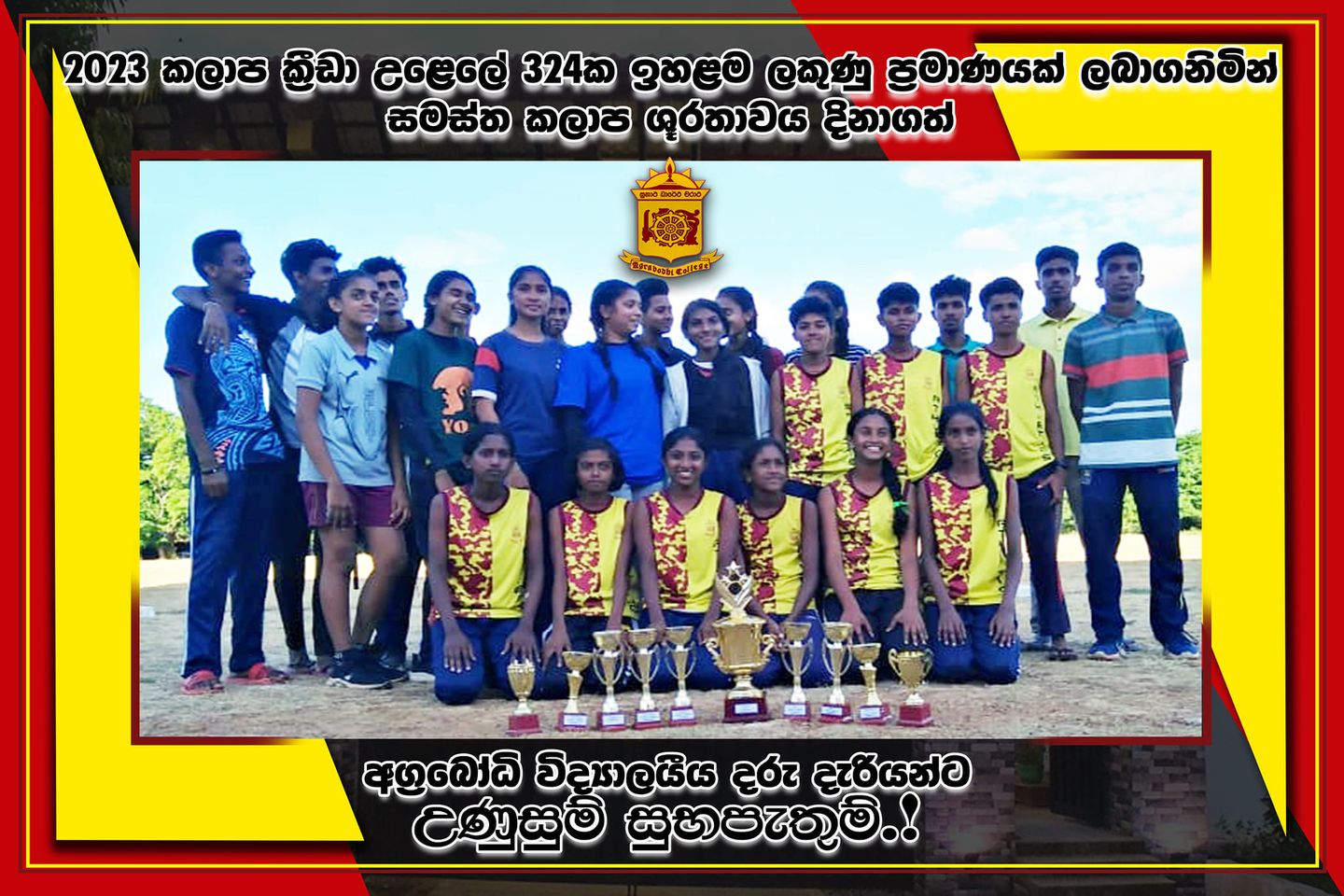 01 Oct2020 2023 කලාප ක්රීඩා උළෙලේ වැඩිම ලකුණු ප්රමාණයක් ලබාගනිමින් සමස්ත ශූරතාවය දිනාගත් අග්රබෝධි විද්යාලය 2023 කලාප ක්රීඩා උළෙලේ වැඩිම ලකුණු ප්රමාණයක් ලබාගනිමින් සමස්ත ශූරතාවය දිනාගත් අග්රබෝධි විද්යාලයීය දරු දැරියන්ටත් ඒ සදහා කැපවූ ක්රීඩාභාර ආචාර්ය ගුරුභවතුන්,පුහුණුකරුවන් සියලුදෙනාටත් විද්යාලයී උණුසුම් සුභපැතුම්.! Read more ...